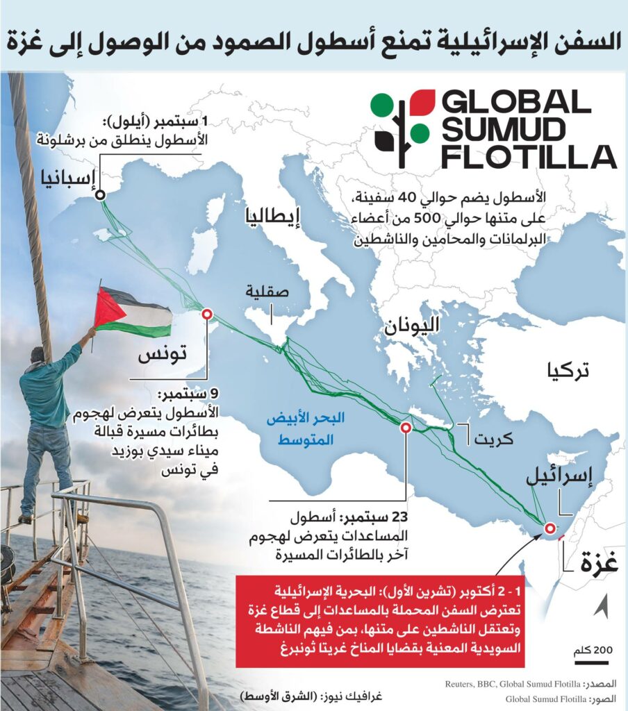 ويضم «أسطول الصمود العالمي» الذي انطلق من إسبانيا، نحو 45 سفينة على متنها مئات الناشطين المؤيدين للفلسطينيين من أكثر من 40 دولة. وينقل حليب أطفال ومواد غذائية ومساعدات طبية، ويؤكد أنه في «مهمة سلمية وغير عنيفة».