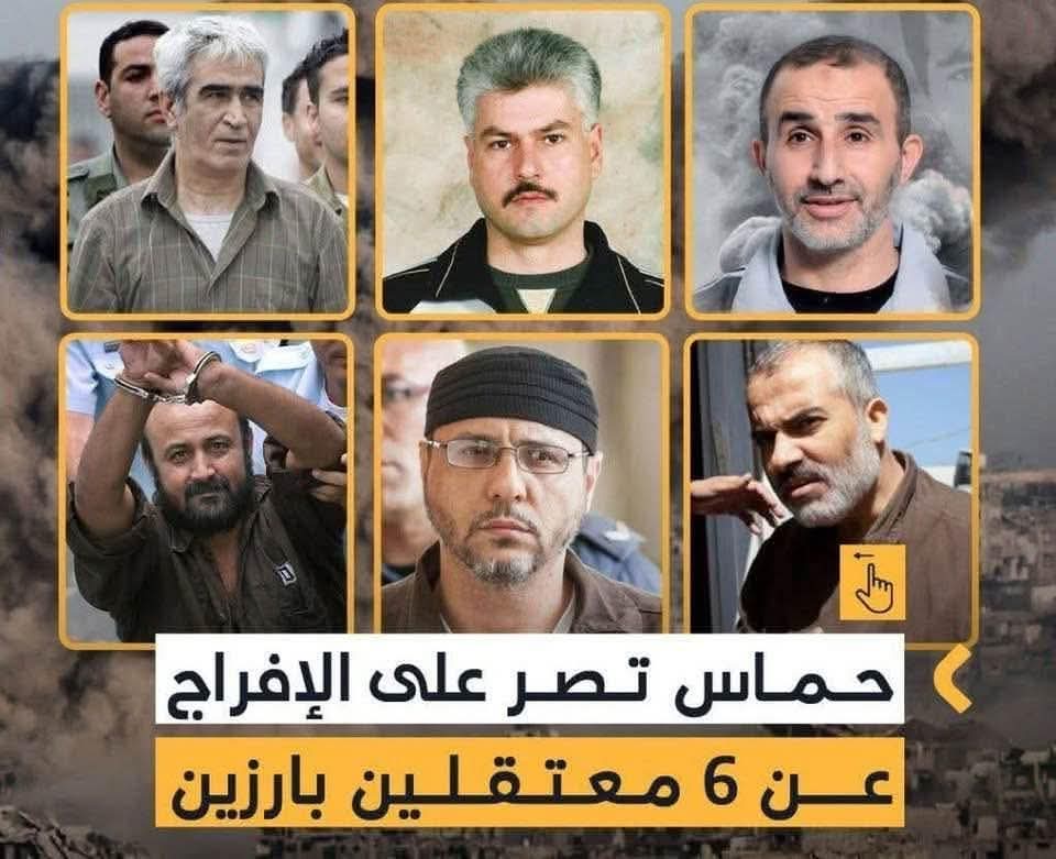 قائمة القادة الستة الأسرى التي تصر حركة حماس على إطلاق سراحهم والذين حيدتهم السجون و يخشى من عودتهم لتصدر المشهد القيادي للمقاومة وهم :