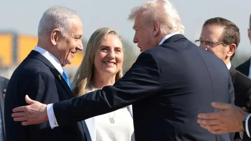واستقبل ترامب خلال مراسم رسمية، كل من الرئيس الإسرائيلي إسحاق هرتسوغ ورئيس الوزراء بنيامين نتنياهو والمبعوث الأمريكي للشرق الأوسط ستيف ويتكوف وصهر الرئيس الأمريكي جاريد كوشنر وزوجته إيفانكا ترامب.
