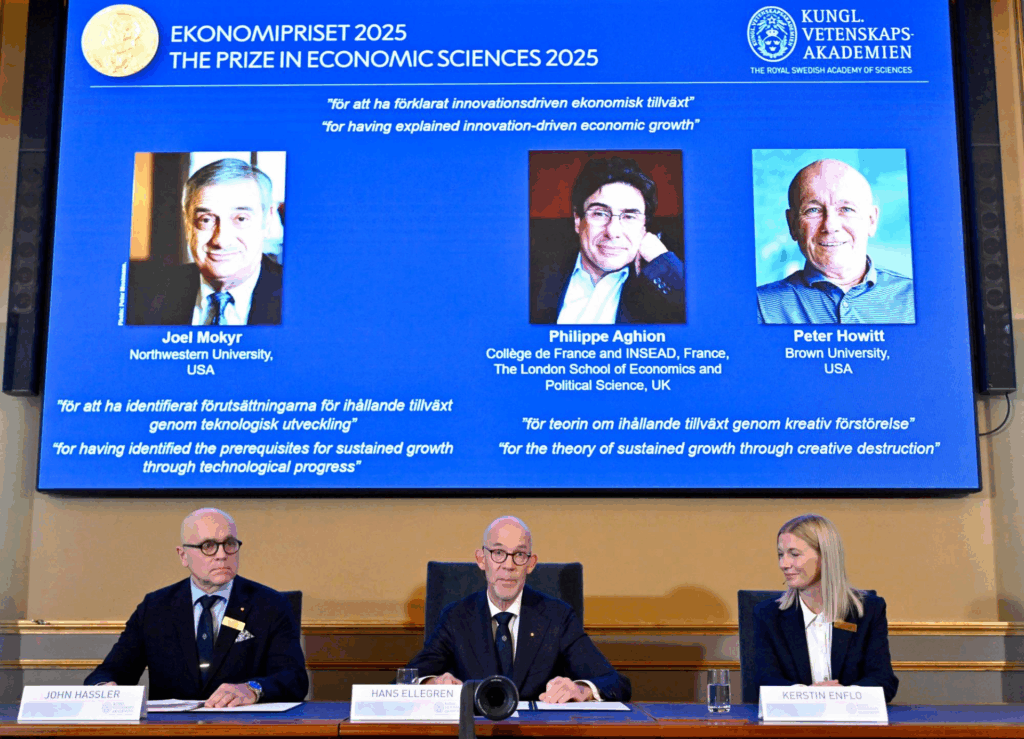 أعلنت الأكاديمية الملكية السويدية للعلوم، الاثنين، فوز كل من الأميركي – الإسرائيلي جويل موكير، والفرنسي فيليب أغيون، والكندي بيتر هاويت، بجائزة «نوبل» للعلوم الاقتصادية؛ وذلك عن أبحاثهم التي تناولت شرح كيف يمكن للابتكار أن يقود النمو الاقتصادي.