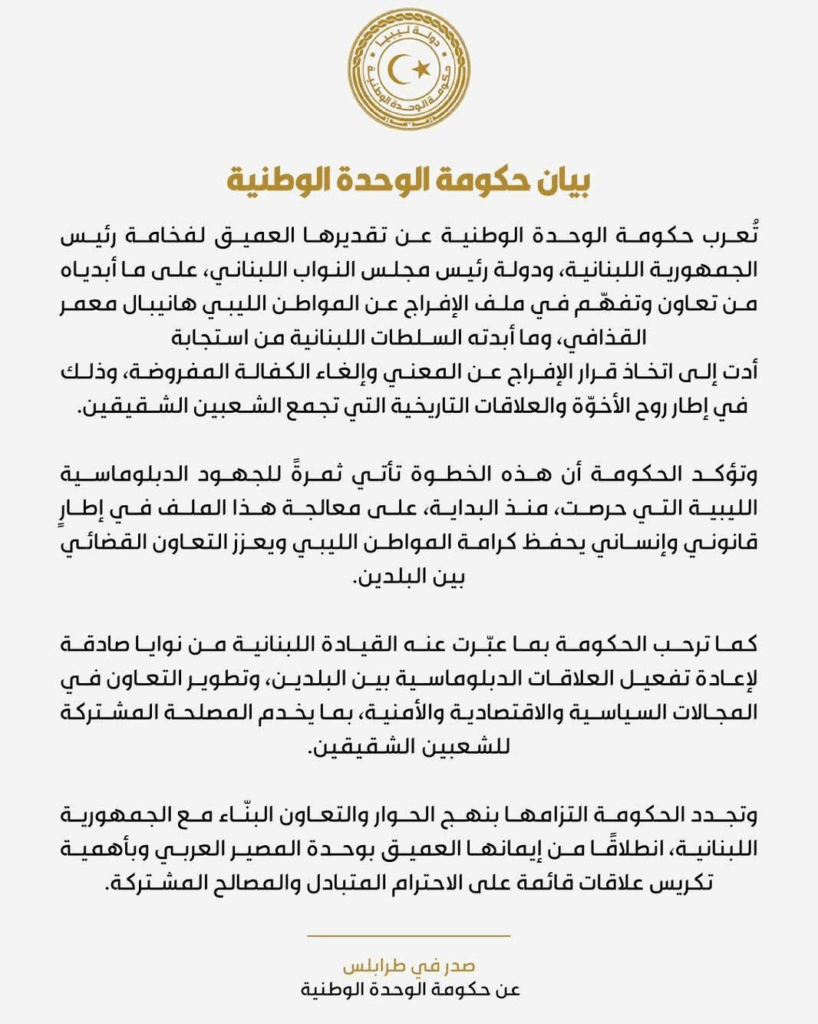 وأكد البيان أن القرار يأتي ثمرة “جهود دبلوماسية ليبية متواصلة ومعالجة قانونية وإنسانية”، مشددا على عمق العلاقات بين البلدين.