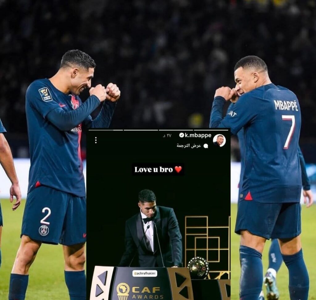 ونشر مبابي عبر حسابه الشخصي بإنستغرام صورة لحكيمي وهو يحمل الكرة الذهبية معلقا: “أحبك يا أخي.. يا ملك إفريقيا.. أحسنت يا أخي، إنها جائزة مستحقة”.