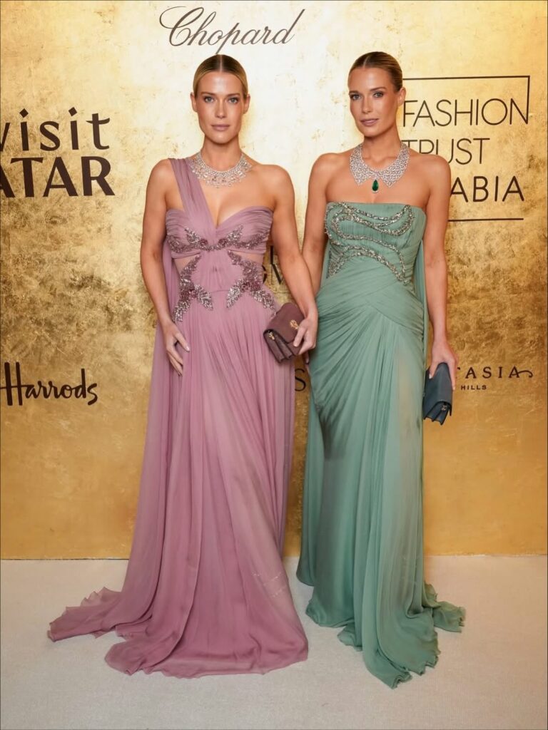 في المقابل، تألّقت ليدي أميليا سبنسر وليدي إليزا سبنسر، ابنتا أخت الأميرة ديانا، بإطلالتين ساحرتين من مجموعة زهير مراد الجاهزة لخريف 2025. ارتدت أميليا فستاناً من الشيفون باللون الأرجواني، مزوّداً حمالة غير متناظرة وتفاصيل “درابيه” على الصدر مع تطريزات دقيقة على الصدر.. فيما اختارت إليزا فستاناً باللون الأخضر الفاتح من الشيفون، من دون أكتاف، مع تنفيذ تقنية “الدرابيه” على الصدر، وخيوط كريستالية كثيفة تحدد الصدر وشق أمامي طويل أضفى على إطلالتها فخامة وجرأة.