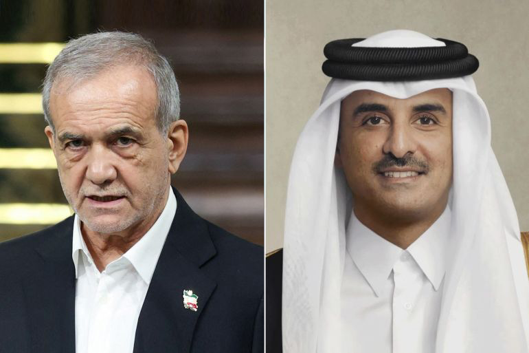 أجرى أمير دولة قطر الشيخ تميم بن حمد آل ثاني اتصالا هاتفيا مع الرئيس الإيراني مسعود بزشكيان بحثا فيه الأوضاع الراهنة وجهود خفض التصعيد، وفقا لبيان الديوان الأميري القطري.