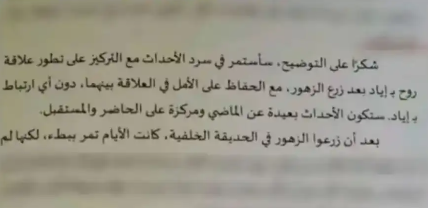 وبعد أن نسي المؤلف حذف الفقرات السابقة، يستأنف التطبيق سرد الأحداث بشكل اعتيادي قائلاً: “بعد أن زرعوا الزهور في الحديقة الخلفية، كانت الأيام تمر ببطء”.